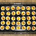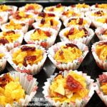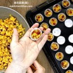 7 Fill into mini paper cup liners, then arrange on baking tray. (Reminder: Divide into 3-4 batches, bake 1 batch at a time, leave some gap between each cup so that it can be baked until completely dried up.)
