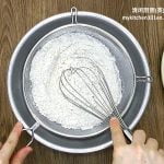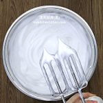 In a clean mixing bowl, whisk egg whites on low speed until foamy. Add in cream of tartar, whisk until small bubbles are formed. Add in fine sugar gradually, whisk on low speed until stiff peak (the peaks will point straight up and hold). (Reminder: Egg whites and equipment used to beat egg whites must be grease-free and water-free, including egg yolk. It is advisable to clean the egg shells and equipment with dishwasher detergent, then dry with a clean cloth. Use a clean small bowl to separate the egg yolk and egg white, if the egg yolk cracks, don’t use that egg white.)