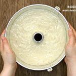 8 Tap mixing bowl on countertop for a few times to burst large bubbles, then pour batter into 22-cm loose base tube pan (do not grease), tap tube pan gently again on countertop for a few times.