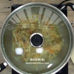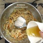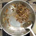 - Add in pork and cuttlefish strips, sliced mushroom and ground pepper, cook until fragrant.