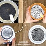 (Notes: Black sesames contain oil, black sesame powder will become wet when ground, icing sugar helps absorbing the oil and make it easier to process the black sesame until fine. )