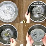 - Combine glutinous rice flour, ground sesame and plain flour, sift through and mix well.