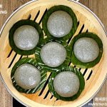 7 Coat palms with oil, shape dough into a ball, put onto a piece of banana leaf, press lightly with palm, then arrange in steamer rack.