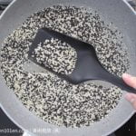 2 Toast seeds in dry frying pan over medium-low heat until the sesame seeds start popping, it takes about 10 minutes. Toasting time may differ depending on your cooking temperature.