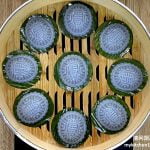 Flatten dough with palm, top with a piece of filling, wrap filling fully with dough, press until firm and shape gently into a ball. Put into mould, press lightly into mould with palm. Tap the mould gently on work top to unmould the filled dough, put onto a piece of banana leaf, then arrange in steamer racks.