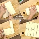 1 Cut each sheet of spring roll pastry into 10 small sheets. (Reminder: You may also use 7.5″ x 7.5″ spring roll pastry which has 50 sheets in each packet, cut each into 8 small sheets to yield a total of 400 small sheets.)