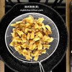 7. Remove deep-fried spring rolls from oil and put on strainer ladle to strain the oil. (Reminder: Turn off the heat first to prevent the oil temperature from rising too high. If the oil temperature is higher than 160°C, let it slightly cool down to about 160°C, then turn to medium heat before adding in the next batch. )
