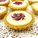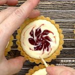 1. Fill baked tart crusts with cream cheese filling, top with strawberry jam, then swirl with wooden stick to create some pattern.