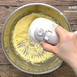 5. Whip dairy whipping cream until soft peak, add to cream cheese mixture, fold until combined. (Reminder: Use stainless mixing bowl for whipping. Keep both mixing bowl and whisk in freezer for 30 minutes to chill them up before using.)