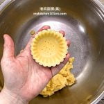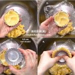 5. Put some dough into tart mould (7-cm), cover with a piece of cling wrap, top with a smaller tart mould (6.5-cm), press down to fill dough into the larger mould.