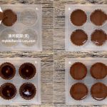 Pour some chocolate agar-agar mooncake paste mixture into 4 paper muffin cups (top diameter=6 cm, bottom diameter= 5 cm, height= 4.8 cm). Add in agar-agar “egg yolk”. Add in more chocolate agar-agar mooncake paste mixture until the total weight is 60 g.