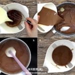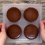 3 Pour some chocolate agar-agar mooncake paste mixture into 4 paper muffin cups (top diameter=6 cm, bottom diameter= 5 cm, height= 4.8 cm). Add in agar-agar “egg yolk”. Add in more chocolate agar-agar mooncake paste mixture until the total weight is 60 g.