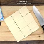 1 Cut each sheet of spring roll pastry into 9 small sheets.