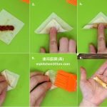 3 Put some sambal dried shrimp on 1 small sheet, wrap the dried shrimp up, brush the pastry end with some water, seal the spring roll properly.