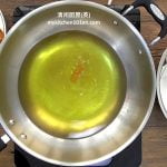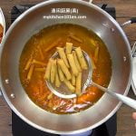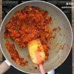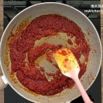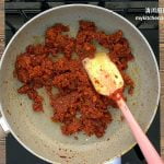 Pour chili paste into frying pan, heat over medium heat until boiling, reduce to medium-low heat, continue stir cooking for 7-8 minutes until the chili paste starts to have fragrance.