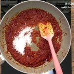 4 Pour chili paste into frying pan, heat over medium heat until boiling, reduce to medium-low heat, continue stir cooking for 7-8 minutes until the chili paste starts to have fragrance.