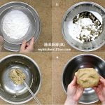 - Mix together plain flour, glutinous rice flour and baking soda, then sieve into a mixing bowl. Add in cooled brown sugar syrup and instant yeast, mix into a dough with chopsticks. Add in corn oil, knead until well blended. (Reminder: Baking soda doesn’t act as leavening agent in this recipe, but to neutralize the acidity of dark brown sugar, do not omit it.)