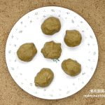 5 Mix together plain flour, glutinous rice flour and baking soda, then sieve into a mixing bowl. Add in cooled brown sugar syrup and instant yeast, mix into a dough with chopsticks. Add in corn oil, knead until well blended. (Reminder: Baking soda doesn’t act as leavening agent in this recipe, but to neutralize the acidity of dark brown sugar, do not omit it.)