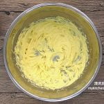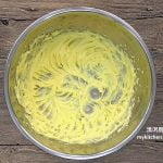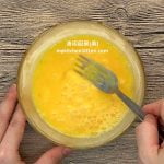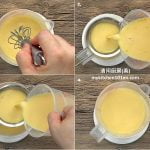 - Add eggs and cooled sugar syrup to evaporated milk and fresh milk, mix until combined, then sieve the egg custard mixture twice, set aside for later use. (Reminder: You can prepare the egg custard mixture in advance and keep refrigerated for later use. Return the mixture to room temperature before using to shorten the baking time.)