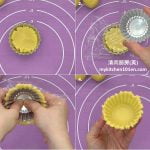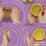 - Flatten the dough with palms, put into tart mould (7-cm), cover with a piece of cling wrap, top with a smaller tart mould (6.5-cm), press down to fill dough into the larger mould.