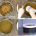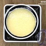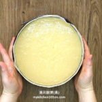 5 Put baking pan with cheese mixture into 9-inch/23-cm round baking pan (line with a thick layer of kitchen towels), then put into 10-inch/25-cm square baking pan. Fill square pan with plain water, about 1.5″ high. (Reminder: I prefer to use plain water for water bath as the cake tends to crack if hot water is used.)