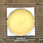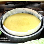 Put baking pan with cheese mixture into 9-inch/23-cm round baking pan (line with a thick layer of kitchen towels), then put into 10-inch/25-cm square baking pan. Fill square pan with plain water, about 1.5″ high. (Reminder: I prefer to use plain water for water bath as the cake tends to crack if hot water is used.)