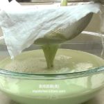 6 Strain the black soybean milk again into large microwavable cooking bowl (I use Pyrex 4-Quart Bowl), add in pandan leaves.