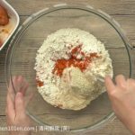 Mix 350g all-purpose flour with ¼ tsp baking powder, 1 ½ tsp salt, 3 tsp pepper, 3 tsp chili powder and 3 tsp sesame seed, whisk and make sure all ingredients is well distributed.