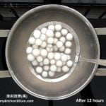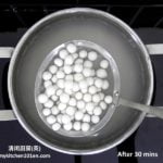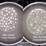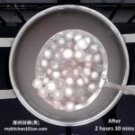 There are 2 ways of cooking big sago using “soaking” method. The 1st way is soaking for 6 hours, you will need to heat up the water a few times during these periods to speed up the cooking process. If you are not in a hurry, you may use the 2nd way, which is soaking for 12 hours or overnight, then reboil the water the next day and continue soaking for 2-3 hours.