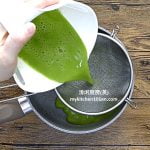 2 Combine salt, lye water and pandan juice, add in green bean starch and cornstarch, mix well, then sieve into a sauce pot.