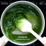 Combine salt, lye water and pandan juice, add in green bean starch and cornstarch, mix well, then sieve into a sauce pot.