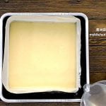 10 Put baking pan with batter into a larger pan, then fill the larger pan with plain water, about 1″ high, for water bath.