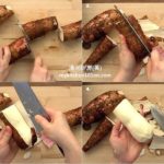 You will need about 1.3 kg of cassava. Cut cassava tubers into 10-cm/4-inch lengths. Make a shallow cut on the skin, then peel off the skin with knife.