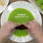 - Put 1 portion of coconut filling onto 1 piece of pandan pancake.