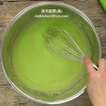 Sieve in plain flour and milk powder, mix until blended, then add in extra pandan juice gradually (about 50 ml, the water absorption capacity for different brands of flour is different, adjust the amount of pandan juice accordingly), until you have a slightly thin batter.