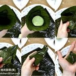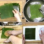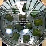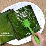 1 Prepare 12 pieces (size: 6″ x 7″) rectangle banana leaves. Blanch in hot boiling water until soften. Wash with dish washing net, then dry with kitchen towels.