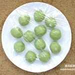 Add hot water (70°C) to 100 g of glutinous rice flour, mix well. Add in pandan coconut milk, mix well. Combine icing sugar and another 100 g of glutinous rice flour, add to mixture, mix into a dough. Add in more pandan juice if needed (about ½ tsp), knead until a smooth dough is formed. Add in cooking oil, knead until well blended.