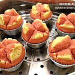 Natural Dual Colour Huat Kuih recipe uses natural red colour from red yeast rice. Top with some plain batter, the huat kuih resembles a dual colour blooming flower when steamed.