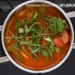 Add in fish, 800ml water, ladies’ fingers, tomato, sprig of laksa leaf. Bring to the boil again, reduce to low heat and cook for 8 minutes or until fish is fully cooked. Reduce amount of water if you prefer thicker gravy.