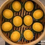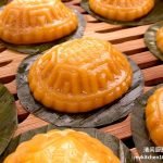 - Prepare 1 tbsp of peanut filling, shape dough into a bowl, fill with peanut filling, wrap filling fully with dough, press until firm and shape gently into a ball. Put into mould, press lightly with palm to fill the mould, tap the mould gently on work top to unmould the filled dough, put onto a piece of banana leaf, then arrange in steamer rack.
