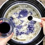 Add bunga telang juice to part of the rice, steam over medium heat for 5 minutes.