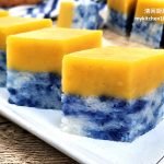 Orange Sweet Potato Vegan Seri Muka (Glutinous Rice Kuih) is similar to Nyonya Kuih Seri Muka, the bottom layers of both are made with blue pea flower juice glutinous rice. The upper layer of Nyonya Seri Muka is made with eggs, vegan version seri muka replaces eggs with orange sweet potato.