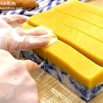 4 Cut Orange Sweet Potato Vegan Seri Muka into pieces using plastic knife after unmoulding.