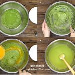 4 Combine corn oil, coconut milk and pandan juice. Sift in cake flour, mix until combined. Combine egg and egg yolks, add to batter gradually, mix until well combined.