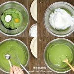 3. Combine pandan juice, coconut milk, egg yolks, salt and sugar, stir until sugar fully dissolved. Combine plain flour, rice flour and baking powder, sift into mixture, mix until well combined. Add in corn oil, mix until combined.
