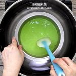 3 Add alkaline water to pandan juice, mix well. Combine rice flour, green bean starch and tapioca starch, add in pandan juice, mix until smooth. Combine plain water, sugar and salt in a sauce pot, bring to the boil, stir until sugar has dissolved. Add hot sugar syrup to pandan mixture, mix until combined. Sieve mixture into stainless steel pot. (Reminder: Alkaline water/lye water is same as the one which is used to make Chinese Alkaline Dumpling/Kee Chang. It gives Kuih Kosui chewy texture and fragrance. )