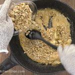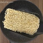 Mix in chopped peanut, turn off the heat and mix in half of the sesame seeds followed by puffed rice. Do not pour in all dry ingredients at once as the candy will cool down too fast and begin to harden. Add in the ingredients separately and work fast before the candy cools.