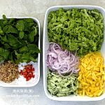 Shred lettuce, onion and cucumber. Cut pineapple flesh into strips. Chop ginger flower. Cut bird’s eye chilies.