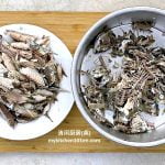 Bring 3300 ml of water to the boil in a large pot, turn to medium heat, cook kembung fish for 10 minutes. Drain cooked fish, remove flesh from fish. Break fish bones into smaller pieces.