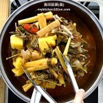 Add fish bones, blended chilli, pounded ingredients, bird’s eye chilies, ginger flower, pineapple, daun kesum, tamarind pieces, tamarind paste and belacan to fish stock. Bring to the boil, reduce to low heat, cover and cook for 1 hour 30 minutes.